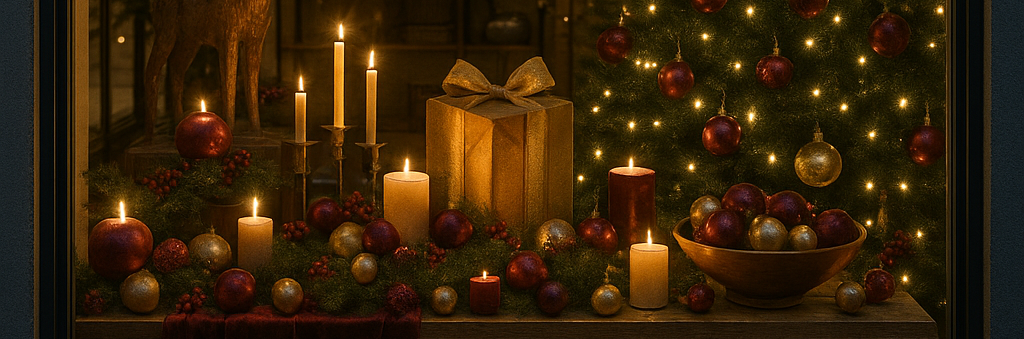 Ook de vensterbank biedt een mooie plek voor subtiele kerstversiering, een mini-kerstwinkel die voorbijgangers betovert zoals op een kerstmarkt. Door te spelen met texturen, kleuren en licht ontstaat een beleving die niet alleen verkoopt, maar ook verbindt.