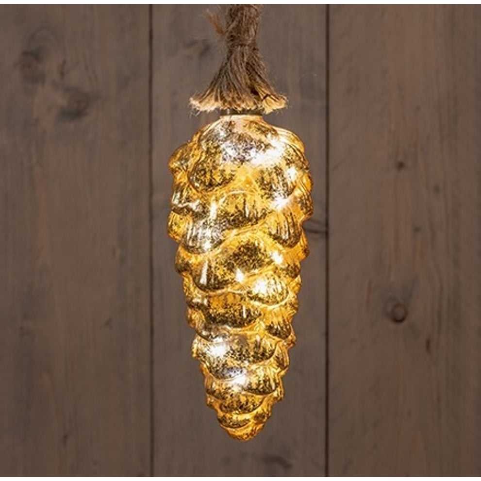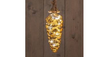 B.O. TANNENZAPFEN GLAS GOLD FOLIE 20CM AUF 60CM SEIL / 15LED WARM WEISS - 2XAA