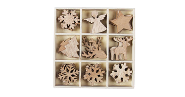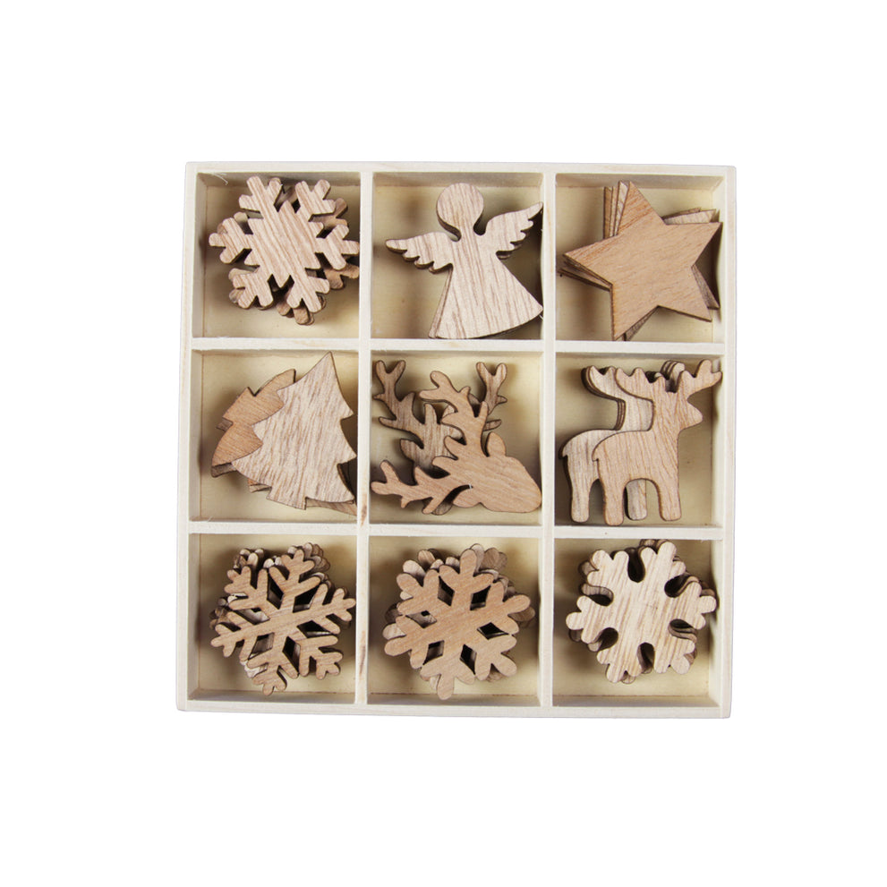 Kiste 36 Holzdeko 9 sortiert ''Weihnachten'' natur 3,5-4 cm