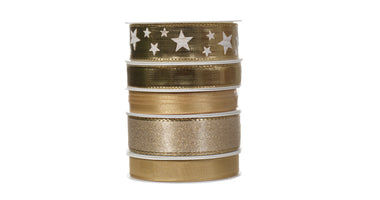 Schachtel mit 5 Rollen Polyesterband, 5 verschiedene Goldtöne, 25 mm, 3 m.