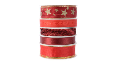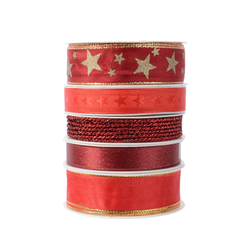 Schachtel mit 5 Rollen Polyesterband, 5 verschiedene Rottöne, 25 mm, 3 m.