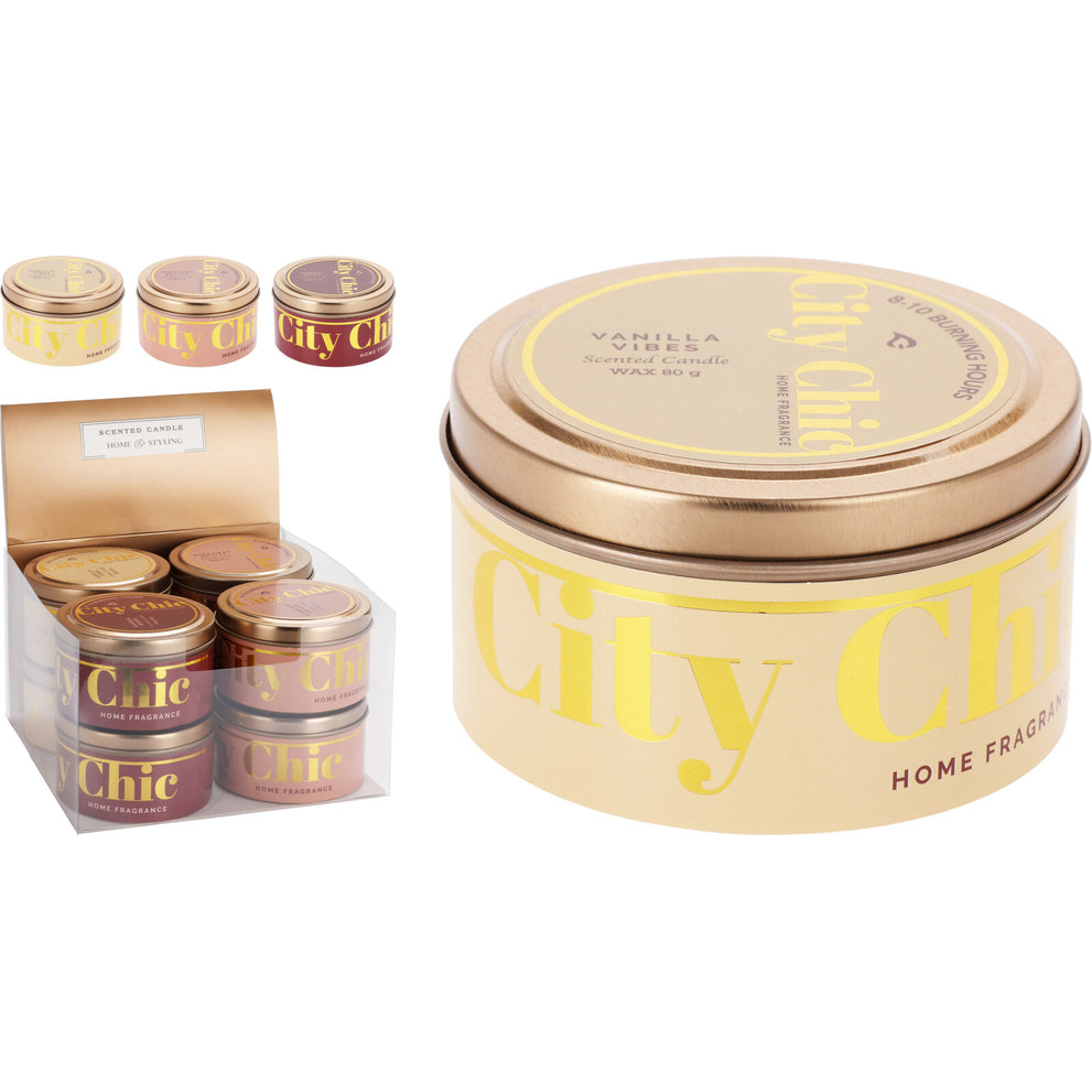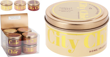 Duftkerze im Blech ''City Chic'' D8 H5cm 3 verschiedene Designs