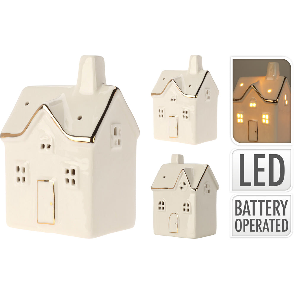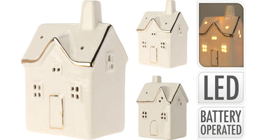 HUIS MET LED PORSELEIN WIT 8X6X12CM 4 ASSORTIE INCL. 3X LR44