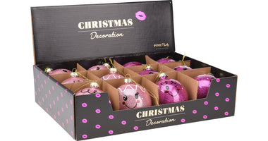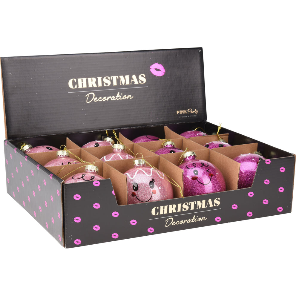Weihnachtskugel aus Glas, Ø 8 cm, Gesicht, Rosa/Fuchsia, 4er-Set