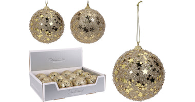 Weihnachtskugel aus Polystyrol, Ø 8 cm, goldglitzernd, 2 verschiedene Designs.