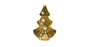 Weihnachtsbaum aus Glas mit 10 LEDs, 3x AAA Batterien, Timer, 15,5 x 9,5 x 24 cm, bernsteinfarben.
