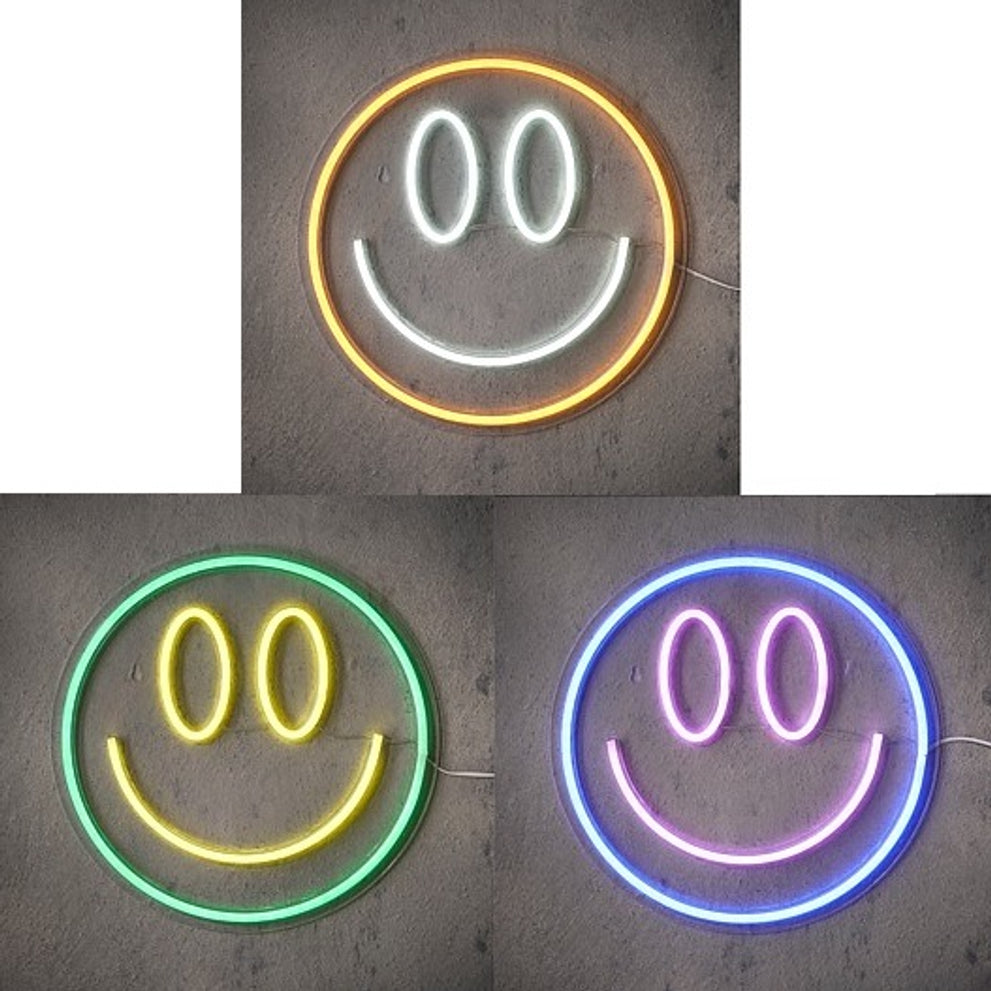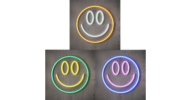 Neon-Licht-Smiley orange blau grün, 3er-Set, LED-Adapter inklusive - B2x D33cm
