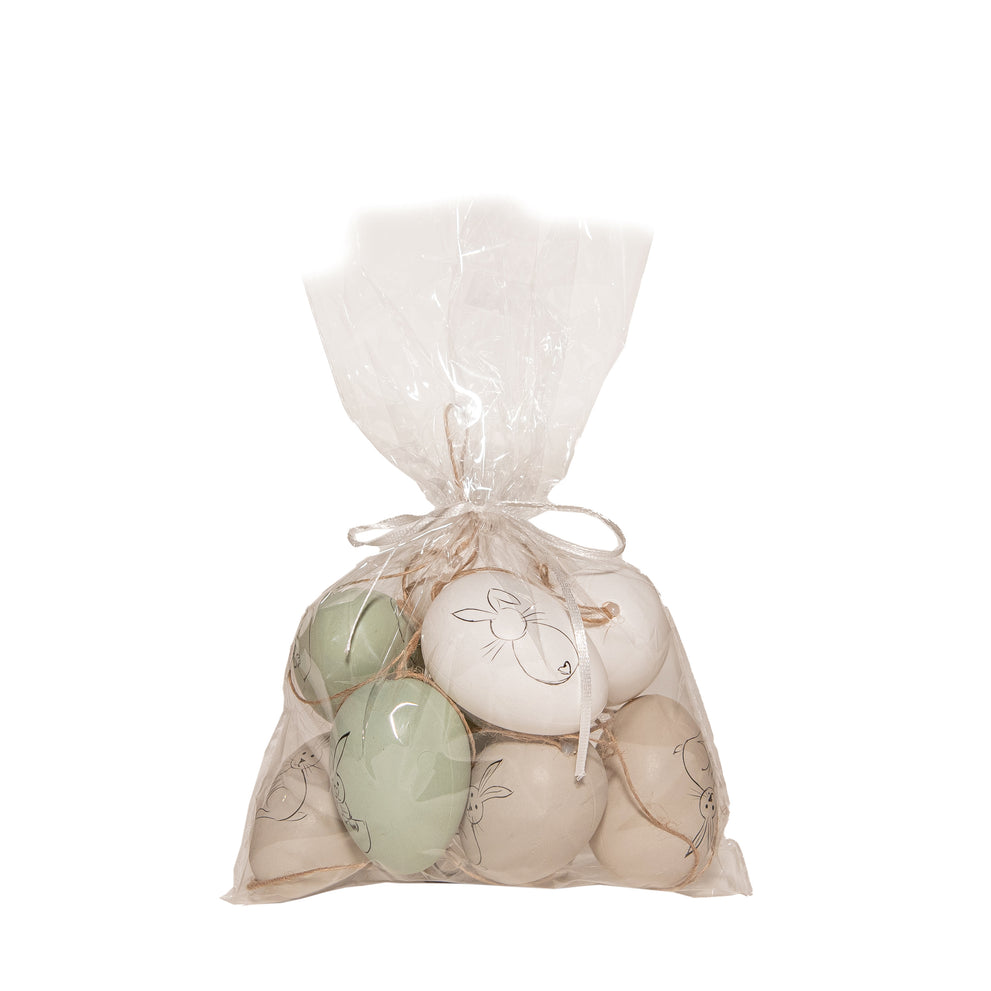 9 Ostereier mit Hasenmotiv im Beutel, Hase grün-weiß.
