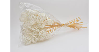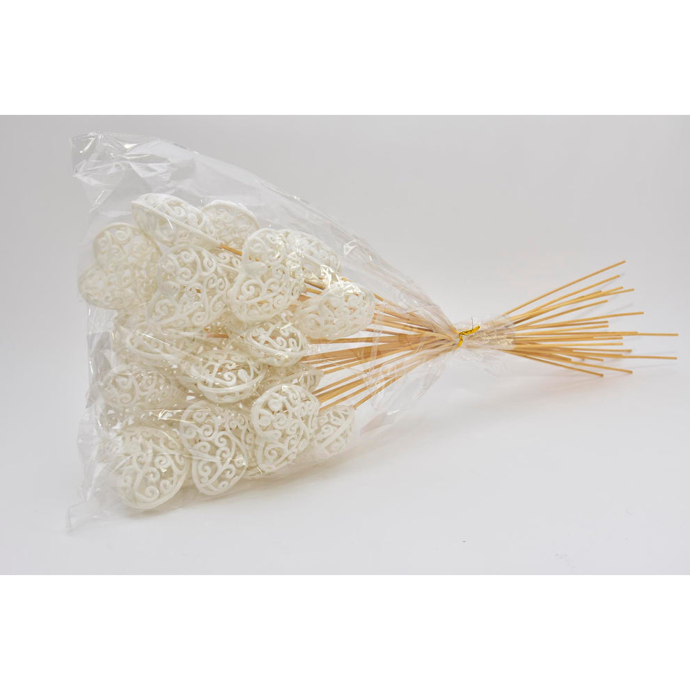 Packung mit 25 Herzen barocker weißer Flock 7x7cm auf 50cm Stick