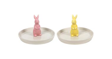 Schaal rond keramiek met konijntje roze of geel 17*17cm 2 assortie