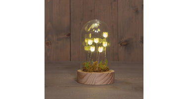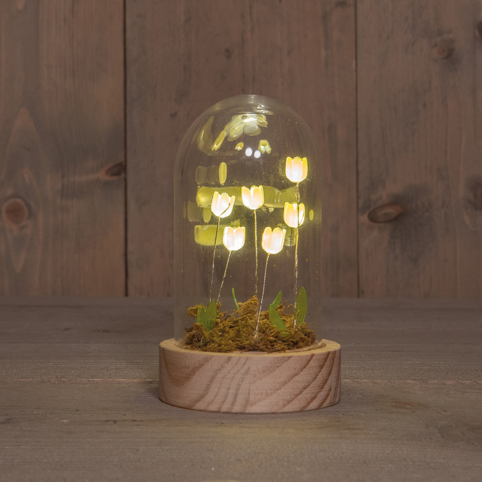 STOLP GLAS MET TULPEN 6 LED OP BATTERIJ 8.5X14CM GEEL