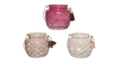 Teelichthalter Glas, Anhänger mit Quaste, Relief D11,5 H10cm 3 Farben sortiert