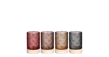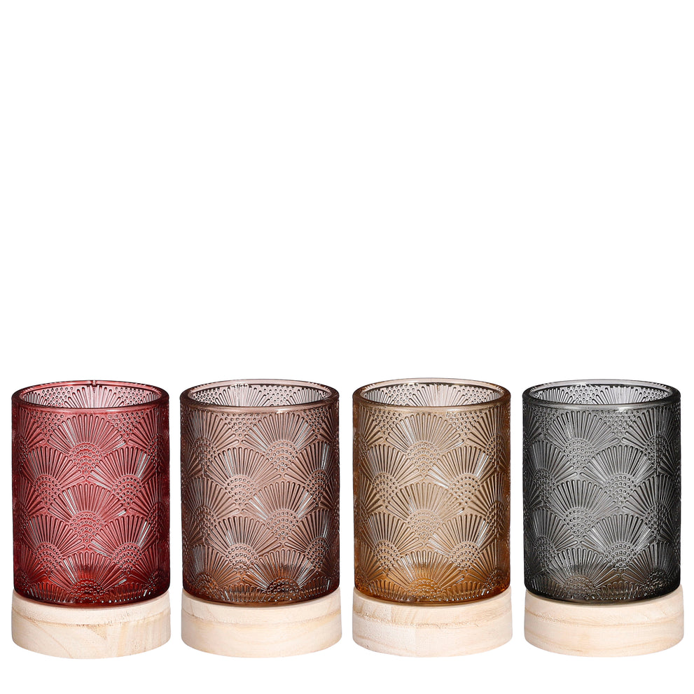 Teelichthalter auf Holzfuß, hellbraun, gelbgrün, dunkelbraun, 4er Set, H14 x D8,5 cm