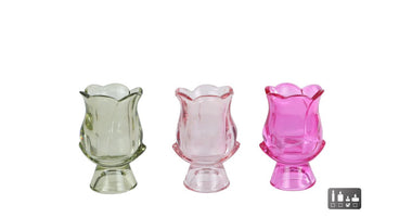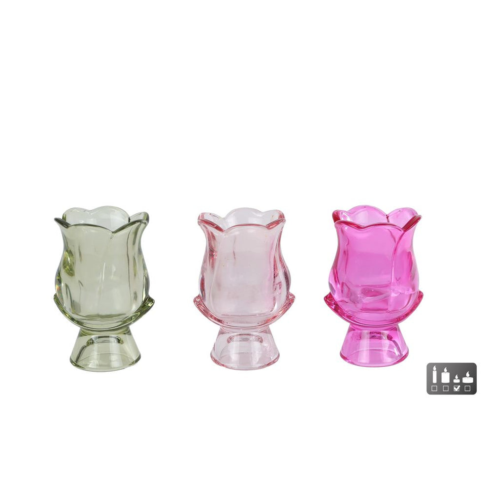 Theelichthouder "Elsie" groen/roze/fuchsia 3 assortie glas7x7x12cm