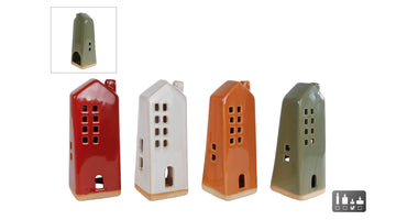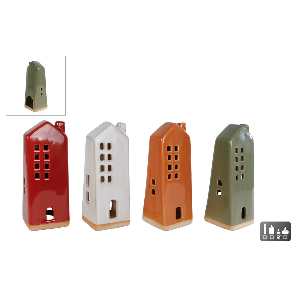Theelichthouder "House" L g/rd/br/iv 4 assortie aardewerk 6,4x6,4x16,6cm